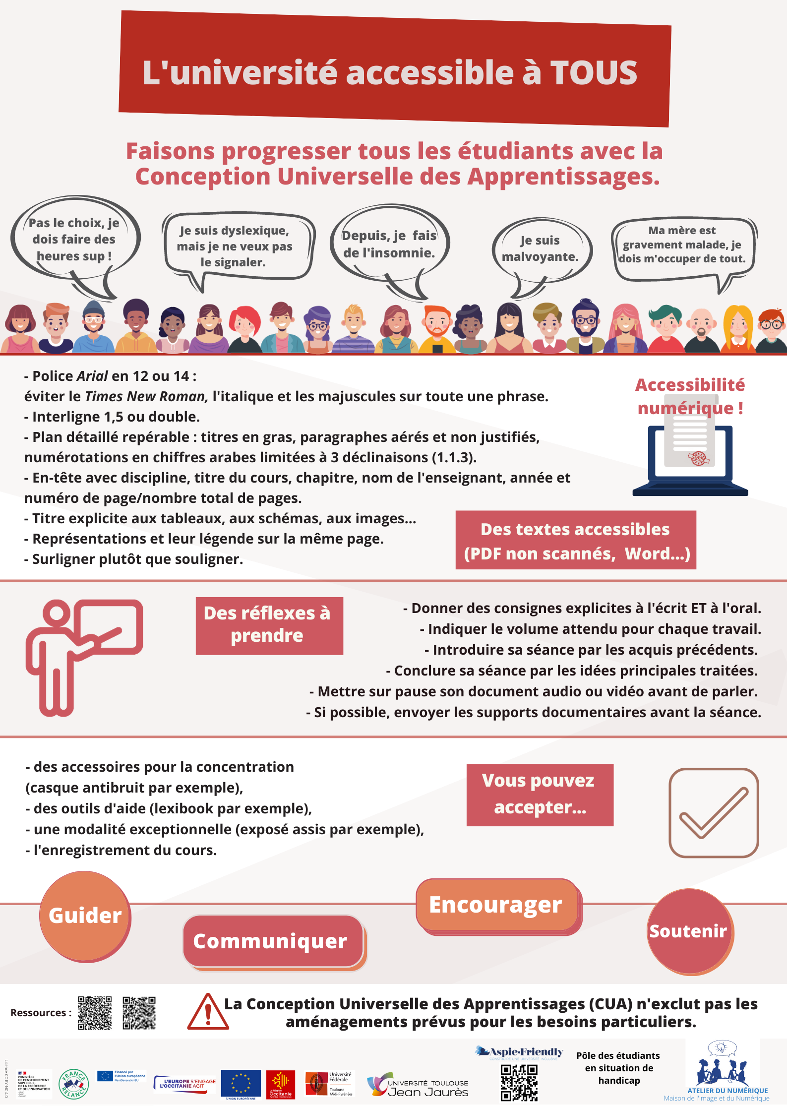 Affiche pour guider, soutenir, encourager tous les étudiants grâce à la Conception Universelle des Apprentissages (CUA)